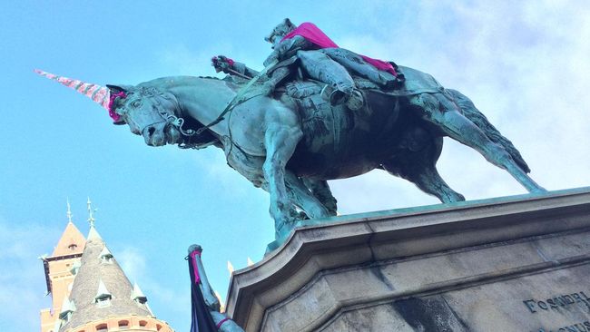 Hela staden är skrudad i regnbågens alla färger och gamla statyer föreställande härförare är tokiga, brokiga i neonfärgade gerilla knitting-kreationer, plymer, boor, och allsköns lullull.