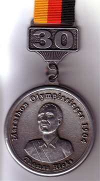 | Medaljerna vid Berlin Marathon 2003, då man firade 30-årsjubileum, pryddes av Thomas Hicks’ porträtt. Hicks kom tvåa i marathon i OS i St. Louis 1904, men fick ändå guld efter att det avslöjats att vinnaren åkt bil halva tävlingssträckan. Hicks kom i mål tack vare, eller kanske trots, att hans tränare under loppet färdats bredvid honom i bil och försett honom med flera doser stryknin blandat med brandy. Snacka om dopning... |