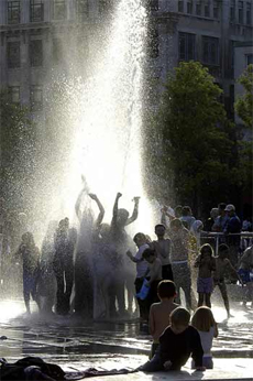 | 1995 ansökte Manchester om att få arrangera Commonwealth Games 2002. Året efter exploderade i jättebomb mitt i stans centrum, med hälsning från IRA och med stor förödelse som följd. Dessa två händelser innebar startskottet för en omfattande förnyelse av den gamla industristaden, ett arbete som fortsatt även efter spelen. På bilden skiner solen i Manchester under The Summer of Love 2002, och boende och tillresta bjuds på en svalkande dusch mitt i stan. |