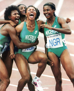 | När frågan om hur man skapar ett långsiktigt framgångsrikt idrottsevent kommer upp, kommer alltid OS i Barcelona 1992 på tal. Det var för övrigt i de spelen som Nigeria kammade hem en oväntad och uppskattad bronsmedalj i damerinas 4x100 meter. Bilden, som är tagen sekunden efter att tredjeplatsen bekräftades på en monitor över löparbanan och totalt glädjefnatt utbröt, kom att ingå i ett samling bilder av Ken Geiger och William Snyder vid The Dallas Morning Post, som året efter rodde hem Pulitzer-priset i fotoklassen. |