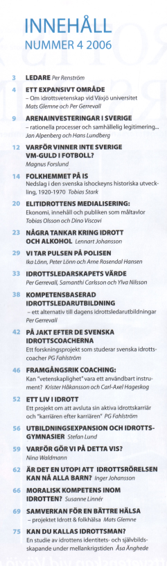 STOPPA PRESSARNA! Blott minuter innan idrottsforum.orgs nya temauppdatering skulle läggas ut till en ivrigt väntande allmänhet dimper senaste numret av Svensk Idrottsforskning från CIF ner på skrivbordet. Också det är ett temanummer, faktiskt, och temat är ”Idrottsvetenskap vid Växjö universitet”. Vi kan bara i korthet trumpeta ut att det verkar vara en fullödig och intressant presentation från kollegerna norröver, och visa omslaget och innehållsförteckningen, samt informera om vart man mailar om man vill beställa ett ex av numret.