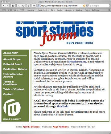 Forumets nya satsning, referee-tidskriften Nordig Sport Studies Forum, har fått en flygande start. Efter tillkännagivandet i förra uppdatering och massdistributionen av Call for Contributions inom det internationella akademiska etablissemanget, har redan flera presumtiva författare uttryckt intresse, och en del har till och med utlovat manuskript senare i höst. Men det finns utrymme för fler cyberspace är oändligt! Gå därför in på den nya tidskfitens hemsida och läs mer om vad vi vill ha kanske är det just din artikelidé och hur vi vill ha det. Och berätta om det nya forumet för dina doktorandet, din professor, dina kolleger.