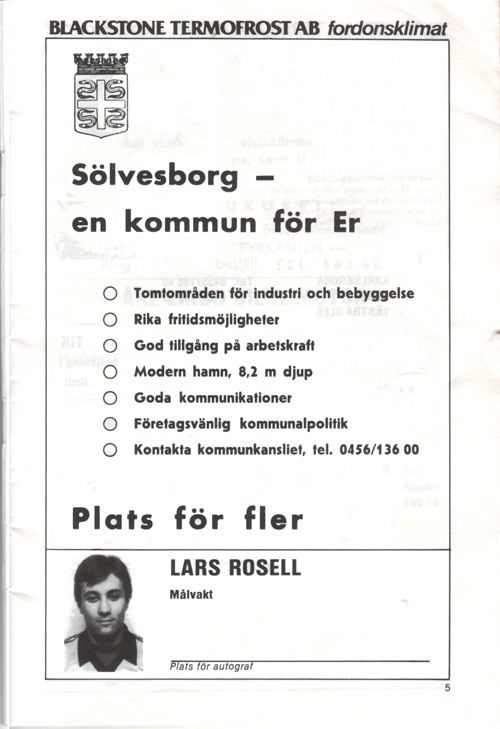 Under 60-talet märks annars att fotbollens kommersiella potential växt. I matchprogrammen, som nu blivit långt tjockare, gjorde alltfler nationella företag reklam för sina produkter (bilar, TV-apparater, försäkringar, tidningar, stora varuhus). En tendens fanns även att städers allmänna attraktivitet började kopplas samman med fotbollen. Ett sådant exempel står att finna i 700-årsfirande Örebro 1965 i programmet till matchen ÖSKDjurgårdens IF (se figur 6). Femton år senare har direkt moderna tankar slagit rot, där Sölvesborgs kommun verkligen lanserar sina företräden i Mjällby AIF:s programblad. Här försöker man aktivt locka till företagsetableringar i orten (figur 7).