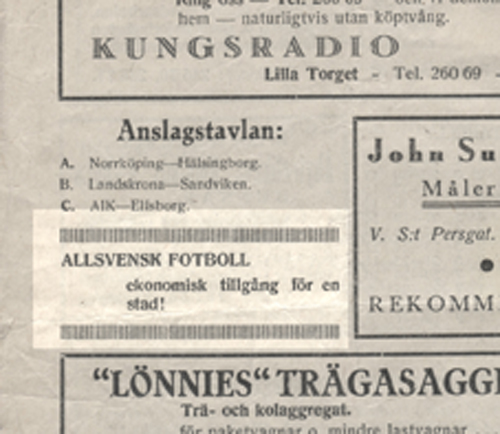 Till VM förväntades en massa turister komma och många anlände också, framförallt tyskar 10 000 kom till Malmö. Frågan är dock vad för bild de fick av Sverige. I tysk press klagades över det torftiga nöjeslivet, den dyra maten och dåliga servicen som gavs i Malmö och Göteborg. Tydligt var att värdlandet Sverige inte gjort mycket extra för att piffa upp VM-städerna polisen hade i alla fall instruerats att le och vara vänliga mot framförallt turister! Dagens Nyheter summerade också VM:et på ledarplats i en turnering där Sverige alltså kommit tvåa med att hävda att evenemanget inte spelade någon roll som propaganda av värde för landet! Yttrandet kan jämföras med den enorma betydelse VM 2006 tillmätts för bilden av ett nytt och vänligt Tyskland. Det kanske viktigaste resultatet av VM 1958 för framtidens evenemangskultur var att Göteborg tack vare anläggandet av Nya Ullevi lagt grunden för sin senare satsning som Sveriges (och Skandinaviens) främsta evenemangsstad. Nya Ullevi blev inte bara landets största arena utan den blev även den mest centralt belägna. Den ansågs också internationellt sett som mycket vacker rent arkitektoniskt. Råsunda och Malmö Stadion hade inte alls samma centrala placeringar. Än viktigare var att Stockholm missade chansen att bli den ledande evenemangsstaden då man valde att inte bygga den sedan länge aviserade nya storarenan i Årsta; i stället renoverades Råsunda till VM. Att Stockholms Stad nyligen återigen fått se sig akterseglade av Solna vad gäller landets nya nationalarena i fotboll lär paradoxalt nog innebära att Göteborg fortsatt kommer att inneha initiativet inom evenemangskulturens område. Allsvenskan I landets städer började man lite mer på allvar att inse värdet av allsvensk fotboll runt 1940. Då diskuterades eller rentav företogs kommunala initiativ på sina håll t.ex. i Umeå och Örebro att slå samman klubbar för att på så vis höja stadens fotbollsstandard. Vid denna tid började också kommunfullmäktiges ordförande att mer regelbundet synas på matcher. Att mer i detalj studera hur och när marknadsföringen av städer via fotboll startar är svårt och uppgiften ligger utanför denna artikels ramar. Ett bra sätt att få en viss inblick i den övergripande utvecklingen är dock att studera klubbarnas programblad. I matchprogrammen har alltid reklam funnits och den visar vilka som genom historiens gång stöttat klubbarna. Här kan man bland annat se när klubbarnas hemkommuner börjar föra in sina marknadsföringsbudskap i programmen. Uppenbart är att det länge mest är lokala småföretag som annonserar i matchprogrammen. Det är frågan om sådant som kaféer, restauranger, hotell och herrklädesaffärer, alltså ställen dit en ganska ung manlig fotbollspublik kunde tänkas gå. I ett program 1940 för matchen IFK NorrköpingHelsingborgs IF står dock i en liten och klart annorlunda notis: ”ALLSVENSK FOTBOLL ekonomisk tillgång för en stad!” (se figur 4).
