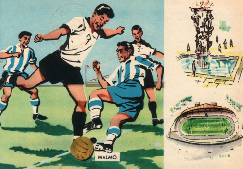 VM i fotboll 1958 Att Sverige fick VM-slutspelet i fotboll 1958 gav den första större satsningen på idrottsarenor i landet. Både Nya Ullevi i Göteborg och Malmö Stadion byggdes speciellt för evenemanget och vidare renoverades och utbyggdes en rad arenor på skilda håll. Den minimikapacitet som krävdes för att få en VM-match var 20 000 platser; det visade sig vara svårt att uppnå för flertalet städer. En intressant detalj är att vissa reklamsouvenirer nu tillverkades för att lansera de olika VM-städerna. Ett exempel var de vykort som presenterade städerna och som bland annat avbildade en lokal attraktion. I Helsingborg var det givetvis Kärnan som visades, medan det i Malmös fall var fontänen utanför Stadsteatern (se figur 3). Exemplen visar hur en stad både kan verka ha stått still eller kraftigt ha förändrats. I Helsingborg är väl Kärnan fortfarande stadens främsta symbol, medan Malmö under senare år rest en rad spektakulära byggnader som definitivt förpassat Stadsteaterns fontän till glömskans marker.