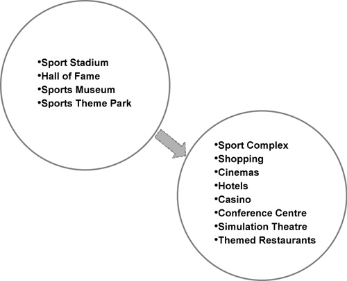 Vi har sett en blomstrande café- och restaurangkultur i städerna de senaste decennierna. Detta har varit en viktig ingrediens i uppsvinget för städernas centrum och den nya urbanismen. I de centrala delarna av städerna finner man ofta nöjesområden. Dessa kan utgöra delar av det som idag kallas för Tourist Business Districts en term som utvecklats från det mer välkända Central Business District. I vissa städer har man anlagt kongress-, konferens- och hotellkomplex i centrala lägen medan de i andra städer placerats i periferin. Oavsett lokalisering ses de som nödvändiga för att locka (affärs)turister och evenemang av olika slag till staden. I många nordamerikanska städer har dessa anläggningar utgjort centrala ingredienser i centrumförnyelseplaner tillsammans med nya sportarenor (Book & Eskilsson, 1999; Delaney & Eckstein, 2003). Arenorna används också i syfte att locka större (sport- eller nöjes)evenemang till staden. Även äldre (mer eller mindre historiska) traditionsbundna arenor används i stadens marknadsföring och lockar besökare, såsom Colosseum och Old Trafford nedan.