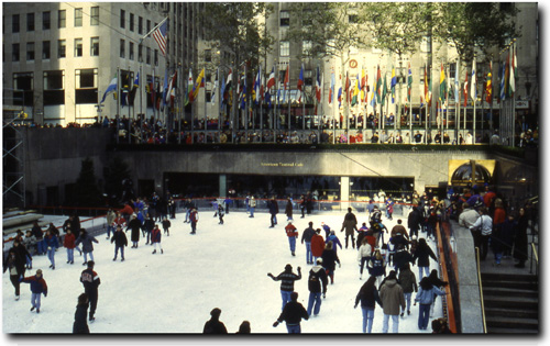 Det har blivit populärt att inom marknadsföringslitteratur tala om de fyra E:na som vägledande principer för till exempel satsningen på urbana projekt i syfte att förbättra en stads image (Pine & Gilmore, 1999). Utvecklingen av de stora komplex som beskrivs ovan täcker på olika sätt in de fyra aspekterna: Entertainment, Excitement, Education och Escapism. En empirisk utblick I den urbana konkurrensen finns det en typ av städer som ett har försprång man skulle nästan kunna säga att de har en sorts monopolstatus. Det handlar om världsstäderna (world cities, global cities, se Hall, 1984; Sassen, 1991; Clark, 1996). Dessa städer, med New York i täten, har redan rätt image, de rätta adresserna (Wall Street, Broadway, Fifth Avenue), internationella organ (huvudkontor, FN:s högkvarter), välkända spektakulära byggnader/byggnadsverk (Empire State Building, Chrysler Building, Brooklyn Bridge och tidigare World Trade Center), välkända komplex och anläggningar (såsom sportrelaterade Madison Square Garden och Yankee Stadium) och symboliskt laddade platser (varav platsen utanför Rockefeller Center på bilden nedan är ett exempel).
