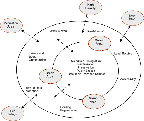 De stadsutvecklingsprojekt som Manchester satsat på är på intet sätt unika. Manchester kan snarare ses som ett typexempel på utvecklingen i den postindustriella staden. Vilka drivkrafter ligger bakom stadsutvecklingen och vad karaktäriserar denna utveckling? Jag är kulturgeograf och som sådan vill jag gärna förstå dels de rumsliga mönstren, dels den övergripande kontexten. Jag kommer därför att sätta in sport och city marketing (vilka är två viktiga beståndsdelar i dagens stadsutveckling) i en vidare urban kontext. Sport kan ses som en liten bit i ett stort urbant utvecklingspussel. Fokus i texten ligger på urbana förhållanden i västvärlden, även om en hel del av de utvecklingsdrag som presenteras också förekommer i andra delar av världen. Om man studerar urban utveckling och planering idag så finns det två övergripande begrepp och tillika processer som måste beaktas; globalisering och hållbar utveckling eller snarare strävan efter hållbar utveckling. Dessa begrepp stöter man på i en mängd olika sammanhang och de är välbekanta för de flesta. Hållbar utveckling och urban planering Vi börjar med att fokusera på det sistnämnda hållbar utveckling (på engelska sustainable development). Begreppet började spridas på 1980-talet men dess verkliga genomslag kom efter FN:s miljö- och utvecklingskonferens i Rio 1992. I samband med denna antogs Agenda 21 som kommit att bli vägledande för arbetet med hållbar utveckling över hela världen. Idag är det välkänt att begreppet hållbar utveckling omfattar tre olika aspekter: ekologisk eller miljömässig hållbarhet, social hållbarhet och ekonomisk hållbarhet. (Newman & Kenworthy, 1999; Hall, 2006) Städer runt om i världen arbetar med att bli mer hållbara på en mängd olika sätt. I stadsmodellen nedan har jag summerat planeringsdrag som ofta används av städer i syfte att skapa en högre grad av hållbarhet (modellen utvecklades ursprungligen av Book & Eskilsson, 2001a). För enkelhetens skull kallar jag modellen Den hållbara staden.
