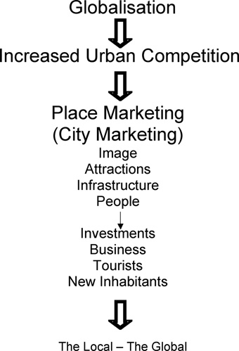 Att kunna bedriva framgångsrik city marketing, marknadsföring av den egna staden, är den i särklass viktigaste funktionen för lokala politiker och tjänstemän i den nya, globaliserade världen. Detta gäller i princip alla städer, från gudsförgätna småstäder bortom allfarvägarna till världsstäder strax under New York-nivån. Det finns en rad olika knep att tillgripa för detta, som alla har det gemensamma målet att staden ska hamna i rampljuset, i första hand med hjälp av media; och ju längre ut från plumset ringarna går, desto högre reklamvärde och desto bättre för staden i en massa olika avseenden. Det kan handla om att locka till sig filmbolag i inspelningssyfte, som i fallet Trollhättan, eller att bli mötesplats för en stor internationell konferens, en miljökonferens kanske hur många kände till Kyoto före avtalet? Eller kanske en världsutställning kan ge effekter? Se vad som hänt med Sevilla efter 1992. Sätten är många, och ett av de flitigast anlitade och mest effektiva är att ro hem ett stort internationellt idrottsevenemang, och då helst ett OS eller fotbolls-VM.
