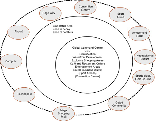 Fokus i den urbana planeringen och utvecklingen i syfte att skapa en konkurrenskraftig stad ligger på två zoner; stadens centrum och periferi. Zonen däremellan, som betecknas som en lågstatuszon bland annat innehållande bostadsområden från cirka 1950-1980 (se beskrivning ovan), anses attraktiv och olönsam att investera i. Därför kommer denna zon att förfalla och degradera ytterligare. Resultatet blir en socioekonomsikt och rumsligt polariserad stad, med tydliga likheter med det som Manuel Castells (t ex 1989) benämner dual city. Stadens centrum har efter flera decennier av nedgång i många fall börjat få uppmärksamhet och ekonomisk nytändning. Detta kan bland annat förklaras med den nya typ av urbanism (här inte synonym med det nordamerikanska fenomenet New Urbanism även om det finns gemensamma nämnare), eller urbana livsstil, som uppstått. Det är önskvärt att ha ett modernt businessdistrikt, ett så kallat Central Business District (CBD) eller ännu hellre ett Global Command Centre med internationella huvudkontor och styrfunktioner. På grund av ökat intresse för att bo i centrum, och möjligheter för fastighetsägarna att få en högre avkastning på sina bostadshus, pågår en gentrifieringsprocess i många innerstäder. Med detta avses en fysisk, social och ekonomisk uppgradering av (äldre) bebyggelse (se t ex Valentine, 2001). Med gentrifieringen brukar också följa ett exklusivare utbud av butiker, restauranger och andra verksamheter. En annan typ av område som ofta rustas upp och omvandlas är gamla hamnområden. Om staden är lokaliserad vid vattnet har det nästan blivit obligatoriskt med så kallad waterfront development (det finns ingen riktigt bra svensk synonym men i vissa fall kan begreppet hamnförnyelse fungera). London Docklands är ett välkänt exempel på waterfront development, men kanske inte det mest typiska. Den vanligaste typen av waterfront development syftar till att skapa ett attraktivt turist- och konsumtionsområde. Bara för att visa på ett sådant exempel kan jag nämna Victoria & Albert Waterfront i Kapstaden. Den är Sydafrikas mest besöka destination och innehåller shoppingcenter, restauranger, barer, hotell- och konferensanläggningar och ett stort utbud av olika aktiviteter och evenemang. Och ett akvarium. Det har nästan utvecklats till en obligatorisk ingrediens inom waterfront development-konceptet (Book & Eskilsson, 1999). Folk gillar att konsumera och för att locka folk med pengar måste staden kunna erbjuda exklusiv shopping. Butiker och märken vill gärna utmärka sig i den urbana djungeln och därför läggs stor kraft på butiksdesign (exteriört och interiört) och -koncept. I de större städerna finner man ofta idag så kallade flaggskeppsbutiker. Sportindustrin är långt framme när det gäller image- och konceptuppbyggnad. Pumas offensiva satsningar på sin image och dess butik på Hamngatan i Stockholm kan ses som ett exempel på detta. Även Nike och Adidas har satsat på stora koncept- eller flaggskeppsbutiker i Stockholm de senaste åren.