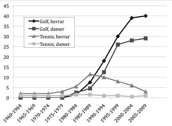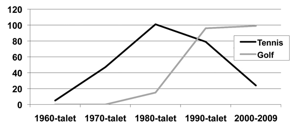 Diagrammet visar att det för svensk damtennis handlat om i snitt en spelare bland de 100 bästa i världen över hela perioden, vid något år har det varit två spelare, andra år ingen alls. Denna position svarar ungefär mot vad man kanske ”normalt” kunnat förvänta sig av ett land med Sveriges befolkningsstorlek. Så var läget länge även för svensk herrtennis, innan framgångsvågen tog fart. Björn Borgs genombrott på 1970-talet var den första riktigt skarpa noteringen i yppersta världseliten och snart fanns ytterligare ett par spelare bland de 100 främsta i slutet av 1970-talet. På 1980-talet kom den stora uppgången med runt 10 spelare stadigt på 100-listan, många av dem bland de allra främsta. Kulmen höll i sig till slutet av 1990-talet då antalet högt rankade sjönk. Under åren 2005-2009 var tennisen nere i ett snitt på 3 herrspelare bland de 100 främsta per år och nu vid ingången till 2010-talet har det sjunkit ytterligare, ner till 1-2 spelare. Den svenska golfen hade endast någon enstaka spelare som kvalificerade sig till proffsspel på världstourerna före mitten av 1980-talet. Mot slutet av 1980-talet började det dock hända saker snabbt och i början av 1990-talet fanns c:a 15 herrar och 10 damer per år som kvalificerade sig i proffsvärldens finrum. Utvecklingen gick framåt med stormsteg och antalet svenska proffsspelare ökade under hela 1990-talet. Vid ingången till 2000-talet handlade det om upp mot 40 herrar och 30 damer som per år kvalificerade sig för spel på proffs-tourerna. Det handlar alltså om ett stort antal individer som kämpat om en plats på toppnivån, varje år har ett par spelare ramlat ur rankingen och försvunnit från proffstouren på grund av att de inte har lyckats tillräckligt bra under säsongen och inte heller lyckats kvala in via de speciella mycket tuffa kvaltävlingarna inför nästkommande säsong. Men det märkliga är att det hela tiden kommit fram nya svenska talanger som fyllt på underifrån, lyckats erövra tourkort och därmed ersatt tidigare proffs på både herr- och damsidan. Vid ingången till 2010-talet finns inga riktigt tydliga tecken på när eller om framgångsvågen ska avta. Möjligtvis har antalet svenska spelare bland de allra främsta i världen sjunkit något färre som vinner de stora tävlingarna alltså samtidigt som det uttrycks oro för att nyrekryteringen bland ungdomar markant försvårats. Men antalet proffsspelare är ännu intakt och år 2009-2010 har ett par helt nya svenska spelare slagit igenom och börjat avancera till allra högsta världsnivån, så framtidsprognosen är svår att göra. Min bedömning är att svenska golfen på världselitnivå kommer att behålla sin goda position ytterligare ett par år men att en liten nedgång snart kan vara i antågande på grund av sviktande nyrekrytering och markant ökad världskonkurrens. Om nedgången blir lika brant som för tennisen är dock svårt att uttala, golfen har sannolikhet större chans att stanna kvar lite längre på en hög internationell nivå, vilket jag återkommer till i slutet av uppsatsen.