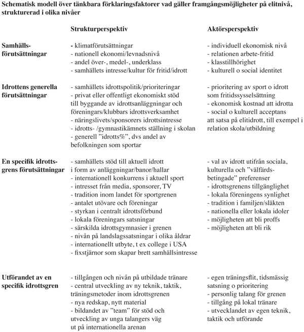 Det finns hypotetiskt ett stort antal tänkbara orsaksfaktorer som kan vara relevanta för att förklara idrottsframgångar på elitnivå. Nedan presenteras en schematisk uppställning av de i mina ögon viktigaste faktorerna i detta sammanhang. Förklaringsfaktorerna är grupperade i fyra olika nivåer från generella samhällsförutsättningar till själva utförandet av en viss idrott. På varje nivå finns dessutom en tudelning i struktur- respektive aktörsperspektiv.