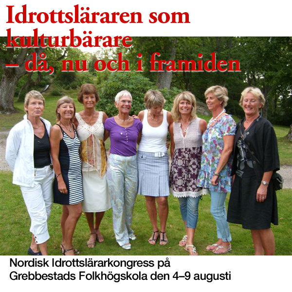 Vartannat år träffas idrottslärare från de fem nordiska länderna på kongress – Nordiska Idrottslärarkongressen, faktiskt – för att diskutera idrottslärarutbildningarna, jämföra förhållandena i de respektive länderna, spana efter nya utvecklingstendenser, med mera, med mera. Dessutom utövar man idrottsliga aktiviteter av skilda slag, som den flitige forumläsaren kunnat göra sig bekant med genom de kongressrapporter som forumet tidigare publicerat, från Island 2005 och Danmark 2007. Rapportör då var Ingegerd ”Pyret” Ericsson, normalt stationerad vid forumets hemmabas. Rapporten i denna uppdatering från den senaste kongressen, som hölls i Grebbestad med Grebbestads folkhögskola som värd, har Ingegerd skrivit tillsammans med några andra svenska idrottslärare som också var där: Yvonne Ekroth, Harriet Eriksson, Lotta Nilsson, Karin Sandén, Kerstin Skoog, Lotta Stenlåås och Nina Unefäldt. Samtliga författare syns på bilden ovan, med ”Pyret” som nr 2 från vänster. I en som vanligt rikt illustrerad rapport får vi en detaljerad redovisning av femnationersmötet, som ägde rum mellan den 4 och den 9 augusti på temat ”Idrottsläraren som kulturbärare”. Tillsammans deltog våra rapportörer i samtliga aktiviteter med liv och lust, och liksom alla andra deltagare på plats sätter de högt värde på de här biennala sammankomsterna, som inspirerar och entusiasmerar det vardagliga arbetet mellan kongresserna, och de hyllar såväl miljön, vädret, arrangemanget som kollegorna.