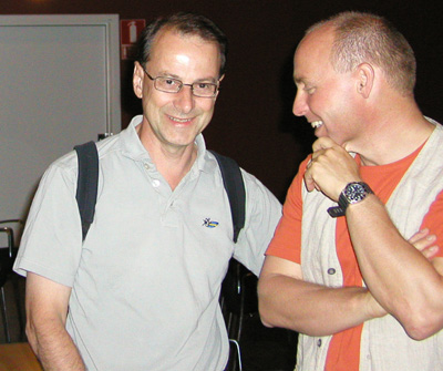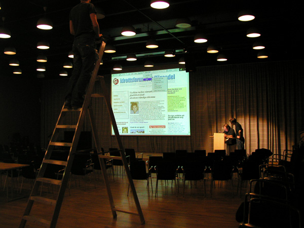 Frenetiska förberedelser strax innan 14.00 då invigningsceremonin ska gå igång. idrottsforum.org's redaktör Bo Carlsson och Jan Olsson från Malmö Stadsbibliotek prövar utrustningen medan Per Mattsson justerar spottarna i taket.