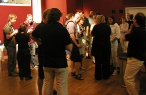 Invigningstalarna konfererar en sista gång innan föreställningen börjar, medan publiken intar sina platser.