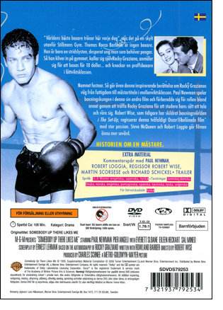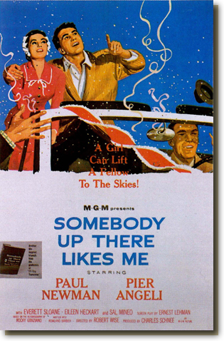Inte få av dessa är filmer med sportmotiv: i den biografiska Somebody Up There Likes Me spelar han boxaren Rocky Graziano, i The Hustler ett slitet biljardess, ”Fast” Eddie Felson. I The Color of Money spelar han åter Fast Eddie Felson, nu som mentor åt en yngre begåvning, spelad av Tom Cruise (filmen var en uppföljare till The Hustler). Man kan notera att även The Sting innehåller ett sportmotiv, i form av hästkapplöpning. Filmer som inte nämnts lika ofta i tidningsartiklarna om Newmans död är två andra sportfilmer, racerfilmen Winning (1969) och ishockeyfilmen Slap Shot (1977). Det tyder på en underskattning av genren sportfilm och de olika betydelser dessa båda filmer haft: Winning tände Newmans eget intresse för bilracing och han kom själv att bli både tävlingsförare och ägare av ett eget racingteam. Det är ingen tillfällighet att Newman fick ge röst åt den tidigare racingbilmästaren Doc Hudson i den animerade filmen Cars (2006), där huvudkaraktären, racerbilen McQueen, för övrigt är döpt efter Newmans skådespelarkollega, sportbilsfantasten Steve McQueen (som själv gjorde en racingfilm, Le Mans, 1971). Slap Shot räknas som den mest klassiska av alla hockeyfilmer och en av de bästa sportfilmerna alla kategorier. Inom hockeykretsar har den kultstatus och har visats i otaliga bussar med ishockeylag på matchresa runt om i Kanada och Nordamerika. Genombrottsroll som Rocky Graziano Efter föga minnesvärda debutfilmen Silverbägaren (1954) fick Newman rollen som Rocky Graziano i Somebody Up There Likes Me, som byggde på Grazianos självbiografi med samma namn från 1954 och regisserades av Robert Wise, som 1949 hade gjort den kritikerrosade boxningsfilmen The Set-Up (och som kom att regissera Sound of Music, 1965). Rocky Graziano, som egentligen hette Thomas Rocco Barbella, föddes 6 juni 1922 i ”Little Italy” på New York’s Lower East Side. Det var också i New York han dog 22 maj 1990. Graziano, som tidigt blev kriminell och tillbringade många ungdomsår på uppfostringsanstalt och fängelse, var världsmästare i mellanvikt 1947/48. Han tog titeln av Tony Zale i den andra av deras tre inbördes matcher och förlorade den åter i den tredje. De tre VM-matcherna mellan Graziano och Zale räknas bland de främsta i boxningshistorien. Graziano försökte senare återta titeln från Sugar Ray Robinson 1952 men misslyckades. Grazianos slutliga matchstatistik, 83 matcher, omfattar 67 segrar (52 på KO), 6 oavgjorda och 10 förluster. Även Grazianos far hade en kort karriär som professionell boxare, under artistnamnet “Fighting Nick Bob”. Att det var just Grazianos liv som filmades 1956, trots att han inte anses som den bäste mellanviktaren, kan ha berott på att Tony Zale var alltför opersonlig, att Jake La Motta var för avvisande och att den svarte Sugar Ray Robinson hade fel hudfärg. La Mottas liv skulle bli film långt senare, med Raging Bull (Tjuren från Bronx, 1980), i regi av Martin Scorsese (Romano 2004:184f). Dessutom var Graziano en större publikfavorit än de andra tre. Han hade också en livshistoria som gjorde sig bra på film dramatisk, tragisk men också med lyckliga vändningar. Ung och missanpassad Somebody Up There Likes Me inleds med att vi får se en liten pojke, Rocky, som blir hunsad, slagen och förnedrad av sin berusade, trasproletäre far Nick (Harold J. Stone), i åsyn av faderns dryckeskamrater. Fadern vill, helt rått, att Rocky ska boxas mot honom och visa vad han går för, men han slår sin son alldeles för hårt, varpå Rocky lämnar rummet ledsen och arg och beger sig ut på New Yorks gator. I nästa scen står lille Rocky framför ett skyltfönster, där han ser en reklamskylt för Fars Dag med en bild av boxaren Gene Tunney. Pojken slår sönder fönstret i hat mot den boxning fadern försöker tvinga på honom och använder för att förnedra honom. I scenen därpå får vi se Rocky som ung, hård och kriminell man på rymmen. Han tar sig hem, där hans snälla, änglalika mor Ida Barbella (Eileen Heckart) tar hand om honom. Fadern däremot är helt fientlig. När han kommer hem, och ser att Rocky är där, säger han till Rocky: ”Jag ser djävulen i dig...” Vad han egentligen ser, men inte förstår, är sig själv, sitt eget misslyckande, i sonen. På morgonen väcker fadern Rocky genom att piska honom med sitt läderbälte och beskylla honom för att pina livet ur sin mor med sina lagbrott. Fadern skriker åt Rocky att han borde ta sig samman och bli något, på vilket Rocky sarkastiskt svarar: ”Vad då, som dig kanske?!” I Rockys ögon är fadern med andra ord en nolla. Efter det oförsonliga bråket med fadern ger sig Rocky ut på bakgatorna igen (i hans kriminella kamratgäng återfinns Steve McQueen i sin första filmroll). Ett mönster börjar nu framgå, i det att Rocky sätter sig upp mot alla auktoriteter som vore de inkarnationer av hans far; sina kamrater är han däremot fullständigt lojal mot. Detta leder till vistelser på uppfostringsanstalter och ungdomsfängelser, varpå han till sist hamnar i ett riktigt vuxenfängelse, Rikers Island. På vägen dit stiftar han i polisbussen bekantskap med en man som visar sig heta Frankie Peppo (spelad av Robert Loggia i sin debutroll); de båda är fastlänkade vid varandra med handklovar. Detta kommer direkt efter en scen där Rocky varit nära att skjuta en vakt på en uppfostringsanstalt, men tack och lov blivit hindrad i sista sekunden av en medfånge som slog en spade i huvudet på honom. Peppo inleder ett samtal med Rocky i polisbussen:
