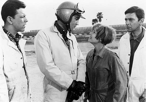 Hela Elvis rockband på i racermiljö. Trummisen Les med sin Beatlesfrisyr spelades av Deborah Walley (1941-2001).