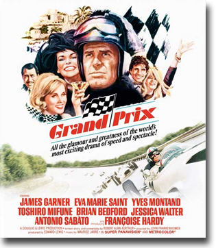 Harrison skrev även en hyllningslåt till F1, ”Faster”, vilken släpptes som singel i England den 30 juli 1979. Den finns också med på albumet George Harrison, ett av många förträffliga Harrison-album; för den intresserade rekommenderas trippelalbumet All Things Must Pass, boxen Dark Horse Years 1976 1992 eller samlingsalbumet Let It Roll: Songs by George Harrison. Helt underbar är minneskonserten Concert for George i Royal Albert Hall 2002, som finns på såväl DVD och Blue-ray som på CD; här en av många höjdpunkter. Låten ”Faster” var inspirerad av olika förare, inte minst Jackie Stewart och Niki Lauda. Faster hade varit titeln på en bok av Stewart, och Harrison hyllade Laudas mod efter dennes allvarliga krasch, då han fick svåra brännskador i bland annat ansiktet. Harrison hyllade också vår svenske F1-hjälte Ronnie Peterson, som förolyckades vid Italiens Grand Prix 1978. Här kan man se och lyssna till Faster; gissa vem som kör bilen Harrison sitter och spelar i... Låten börjar med ljud från F1-bilar, inspelat vid Englands Grand Prix 1978. Videofilmen är dedicerad till Ronnie Peterson, som också förekommer i den. Intäkterna från ”Faster” donerade Harrison till Gunnar Nilssons cancerfond. Nilsson var ytterligare en svensk F1-förare, som även han avled 1978, i cancer. Ja, det var sannerligen ett sorgligt år för svensk motorsport. Själv glömmer jag aldrig var jag befann mig då nyheten kom om Ronnie Petersons död: jag älskade honom högt, han var en sann idol så snygg, så lågmäld, så ödmjuk, så ambitiös. Kort sagt, precis som vi vill att en äkta svensk idrottshjälte ska vara. Hans fru Barbro hämtade sig aldrig efter sin makes död och gick ett hjärtskärande öde til mötes. Här kan man se sweet George Harrison spela en liten hyllningssång till sin vän, den brasilianske F1-föraren Emerson Fittipaldi. Melodin är hämtad från Harrisons egen, mästerliga låt ”Here Comes The Sun” som finns på det sista och kanske allra bästa Beatles-albumet Abbey Road; och här en rörande hyllning till George Harrison av Paul Simon, David Crosby och Graham Nash. Grand Prix Detta leder oss in på en av de bästa racingfilmer som någonsin gjorts, Grand Prix (1966), i regi av John Frankenheimer (19302002). Filmen är gjord mitt under och är i högsta grad en del av bilracing-filmens storhetstid: 1960-talet var inte de patriotiska lagsporternas bästa tid i filmhistorien, ja, ingen god jordmån för sportfilm över huvud taget, beroende på tidens ideologiska, sociala och kulturella turbulens. Den vanligaste formen av sportfilm under decenniet blev istället bilracing: Due in part to a changing social and political climate in America, sport films declined during the 1960s. It is interesting that only one baseball film was released during the entire decade [...]. The majority of sport films featured auto racing, a sport conspicuously absent during the war years (1941-1945) due to fuel and rubber conservation measures.[3]