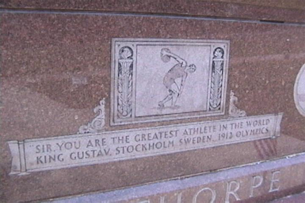 Det förde åter mängder av reportrar hem till Thorpe. En av dessa, Allan Dale, skrev bland annat följande om vad han benämnde som den bäste ”all-round”-idrottare världen skådat: A quarter of a century has passed Jim by since his glorious presentation to King Gustav of Sweden, and the march of time has done things to the rugged redskin who was a veritable Red Grange, Joe DiMaggio, Jesse Owens, and Glenn Cunningham molded in one human frame. At 52 he’s lecturing for a living. Extra work in the movies helps feed four Jim Thorpes in miniature. Four husky, fast-growing boys. (Citerat i Wheeler 1979, s. 198-99.) Detta är bara ett exempel på hur Stockholmsspelen 1912 ständigt kommit att lyftas fram i artiklar, böcker och andra mediefora, här framför allt genom hänvisningen till kung Gustav V som förärade Jim Thorpe så vackra ord vid prisutdelningen, en händelse som även skildras i Jim Thorpe All American. Minnet av vad som tilldrog sig vid OS 1912 finns också inskrivet på Jim Thorpes gravsten, på vilken det står att läsa följande inskription: ”SIR, YOU ARE THE GREATEST ATHLETE IN THE WORLD” KING GUSTAV STOCKHOLM, SWEDEN 1912 OLYMPICS 1888 På alla fyra sidor av gravstenen finns etsningar som skildrar Thorpes indianska arv och hans karriär inom amerikansk fotboll, baseball och friidrott. Runt gravkullen har man spridit jord från platser som varit centrala i Thorpes karriär. På uppdrag av staten Oklahoma har jord sänts från platsen där Thorpe-familjens farm var belägen, från Indian Field vid Carlisle Indian School, från Polo Grounds i New York och från löparbanan på Stockholms Stadion (Wheeler 1979, s. 232).