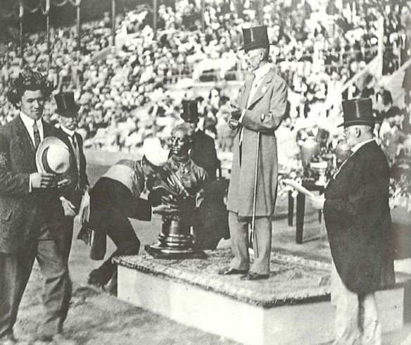 Ovan: Jim Thorpe, till vänster, med lagerkransen som kung Gustav V just satt på hans hjässa.